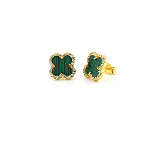 18K Gold Plated over 925 Sterling Silver Green Malachite Clover Stud Earrings