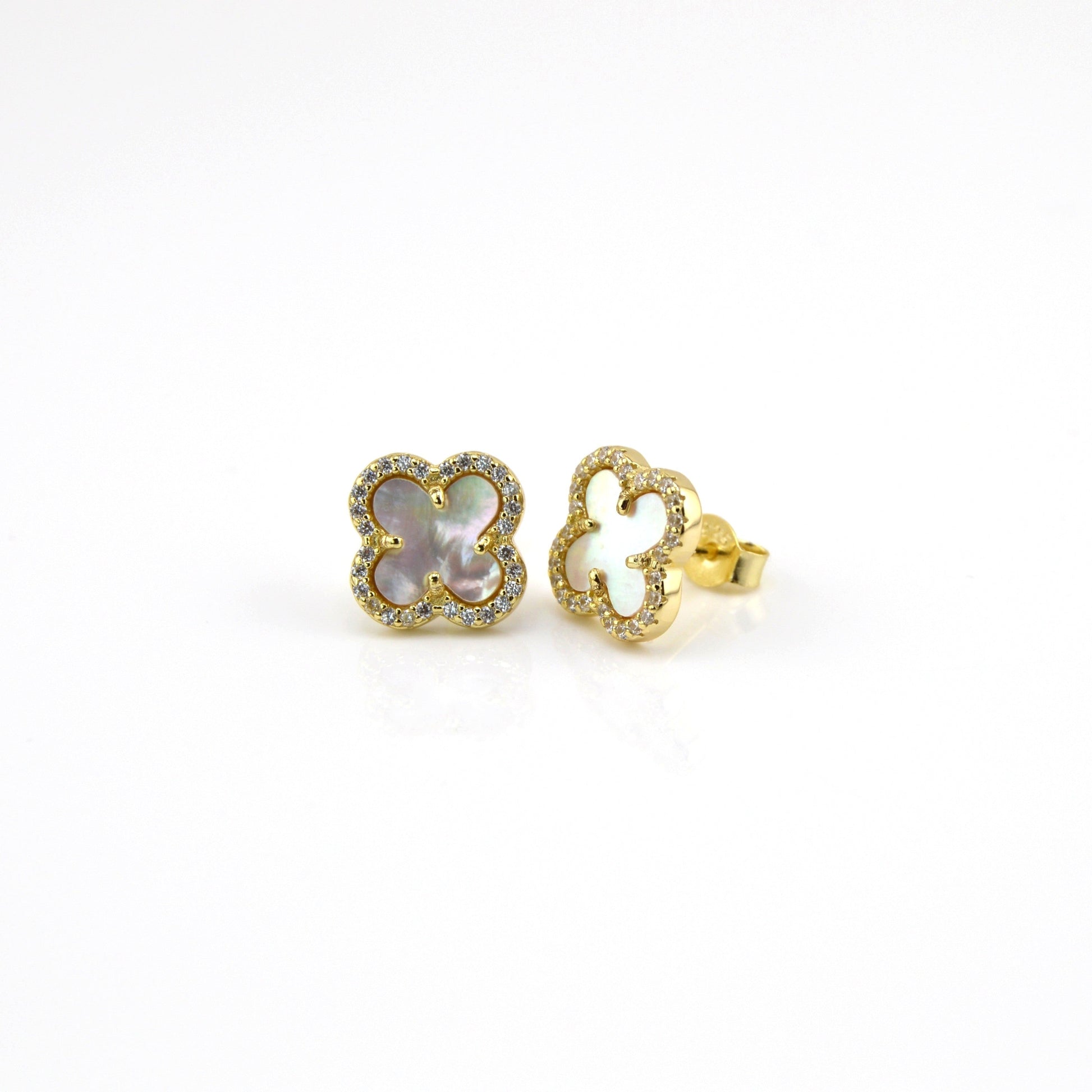 These exquisite stud earrings feature a four-leaf clover design with a mother of pearl center, beautifully framed by sparkling cubic zirconia. Crafted from durable 925 sterling silver and finished with a rich 18K gold plating, they offer a blend of elegance and lasting quality. A perfect accessory to brighten your day and bring a touch of luck and charm to any outfit.