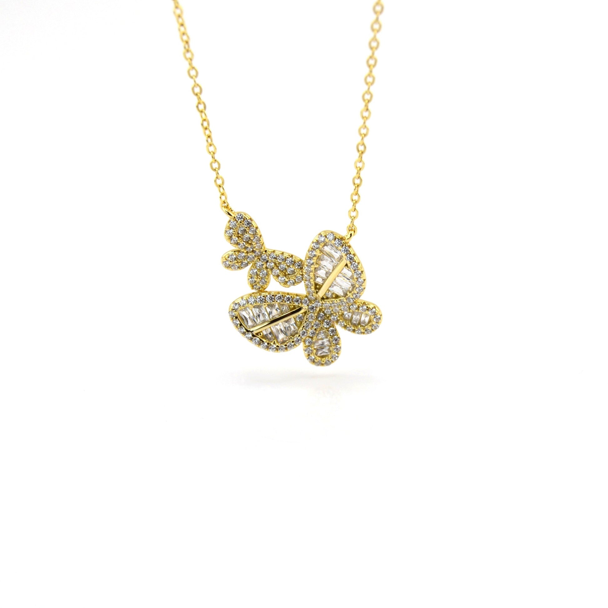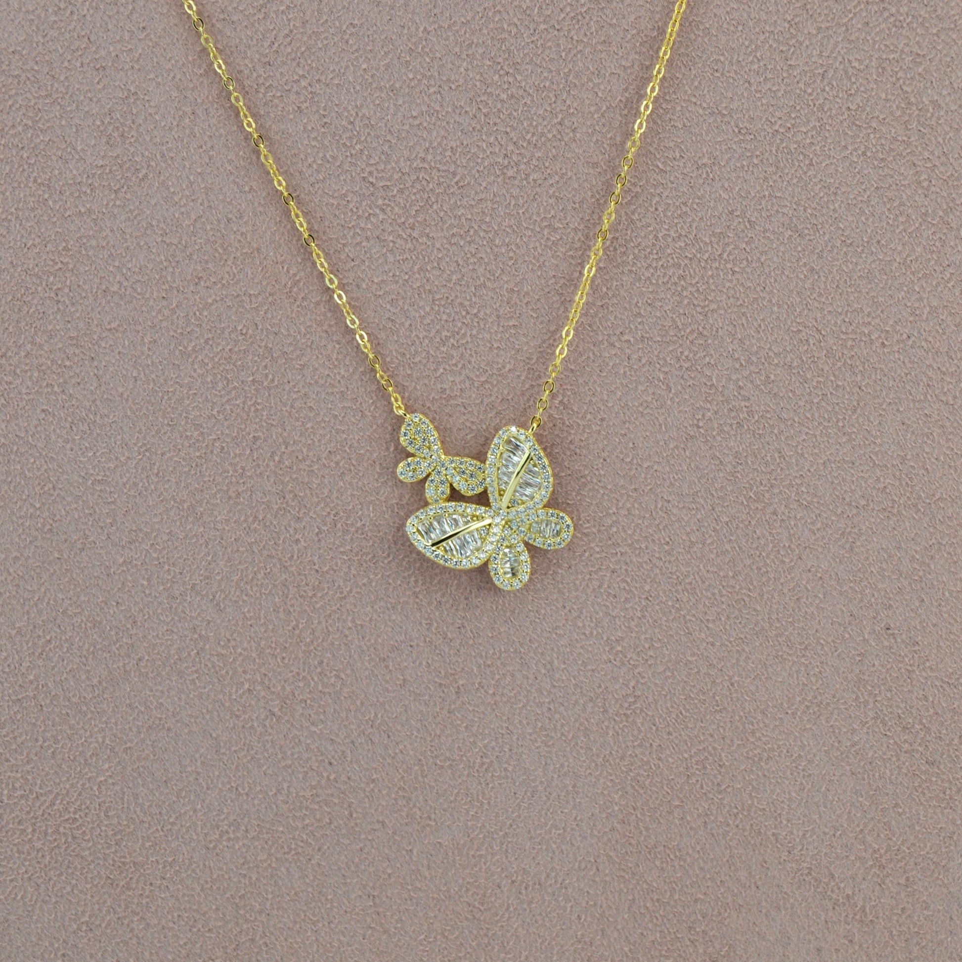 This necklace features two elegant butterflies crafted from 925 sterling silver and plated in radiant 18K gold. Each butterfly is adorned with shimmering cubic zirconia, creating a delicate and uplifting accessory. Designed to inspire confidence and grace, it’s a supportive piece that adds a subtle sparkle to your everyday look.