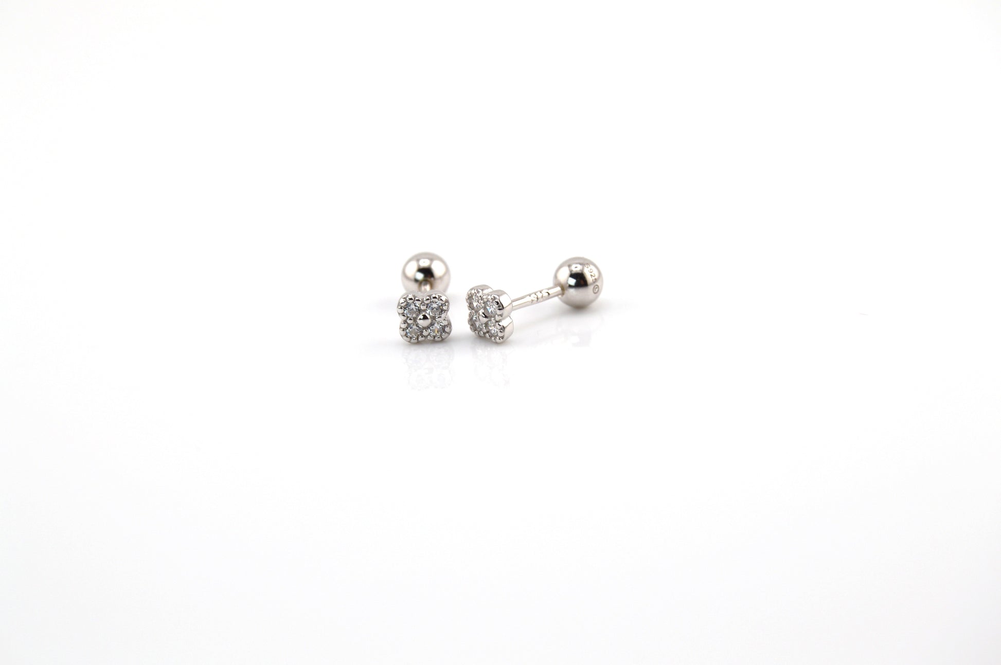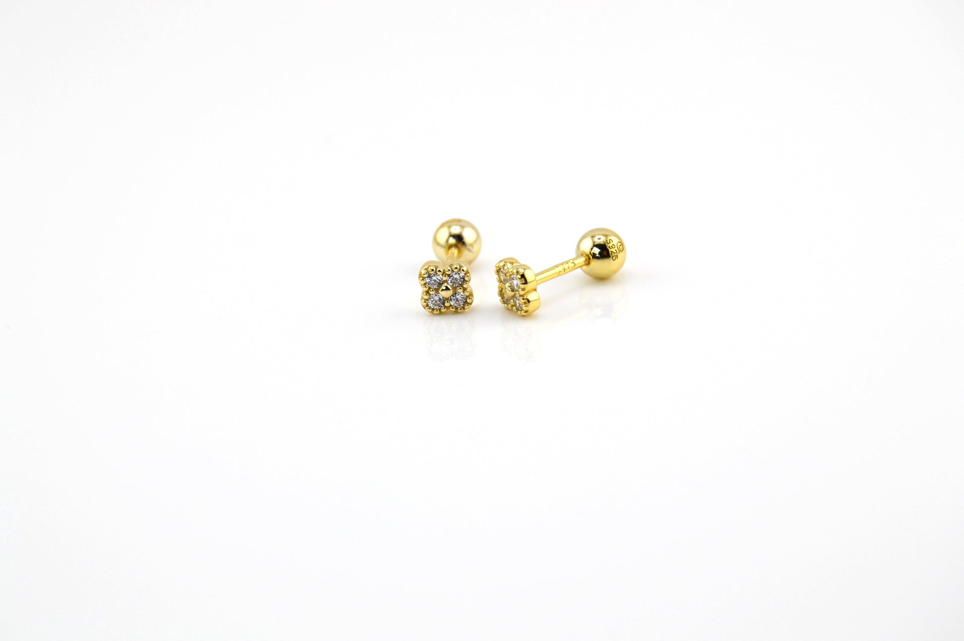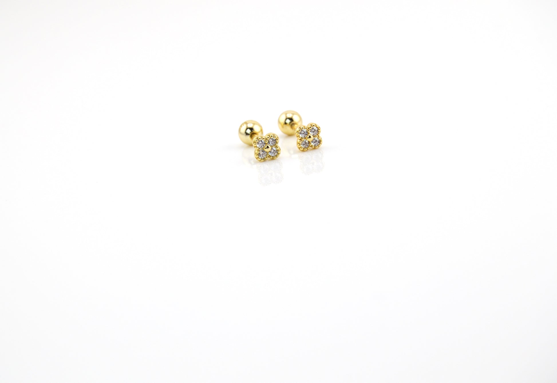 Crafted with quality 925 sterling silver, these dainty stud earrings feature a lucky four leaf clover design adorned with sparkling cubic zirconia. With a secure screw back closure, these earrings are both stylish and practical. Elevate any outfit with a touch of elegance and luck.