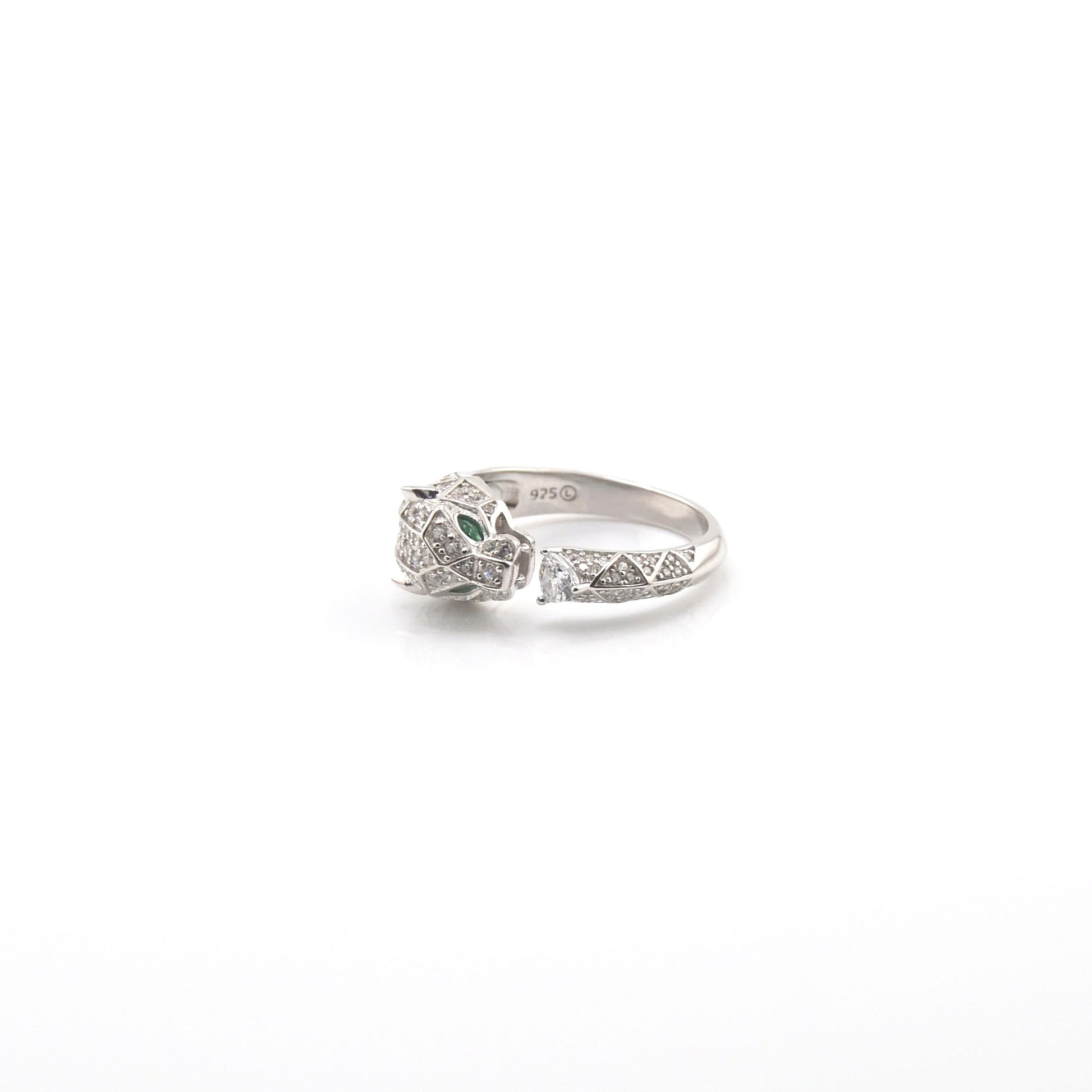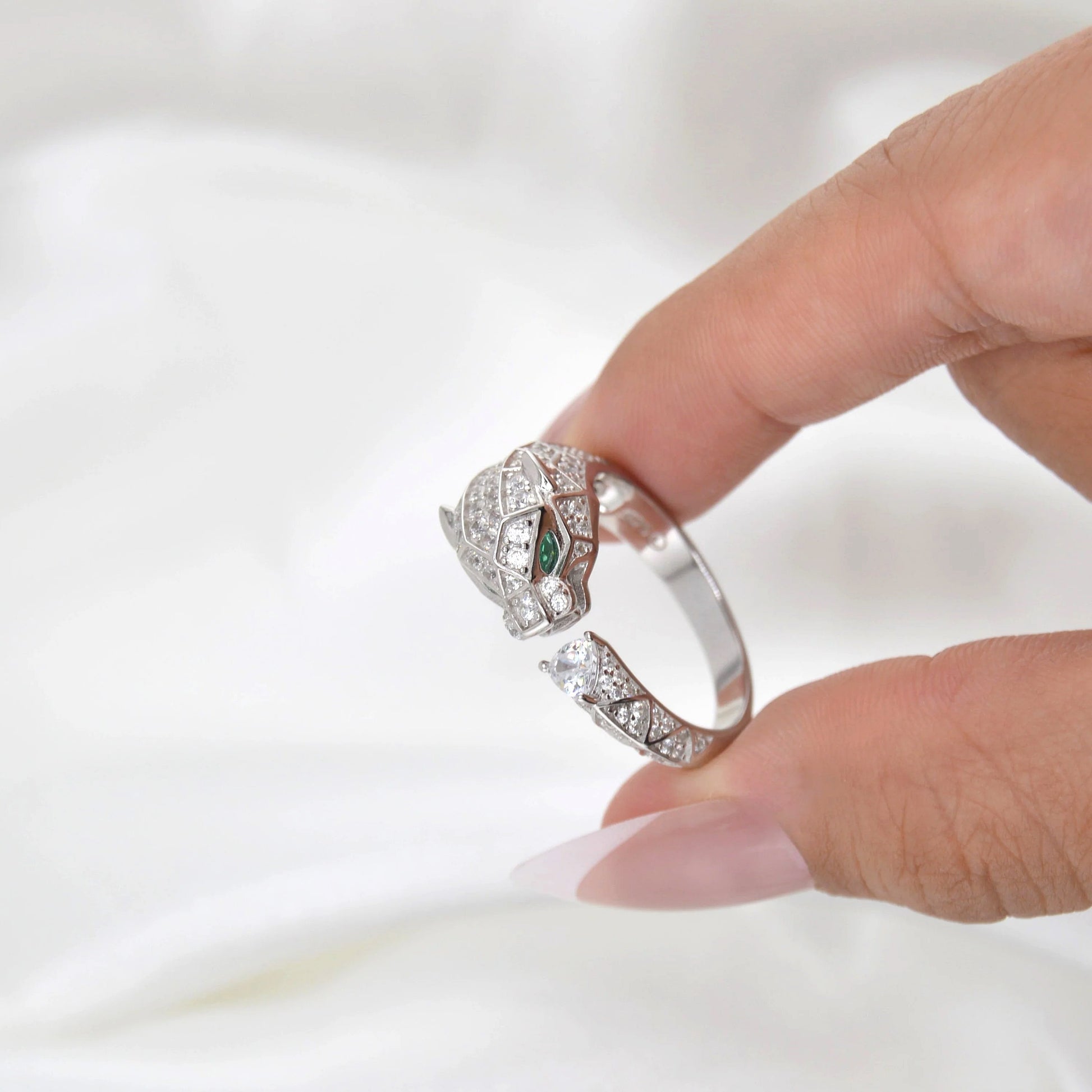 Expertly crafted from premium 925 sterling silver, this distinctive band ring showcases an intricately detailed Jaguar/Panther/Leopard design. The feline's captivating green eyes create a striking focal point, while precisely set cubic zirconia stones add sophisticated brilliance. A sophisticated statement piece for those who appreciate fine jewelry with distinctive character.