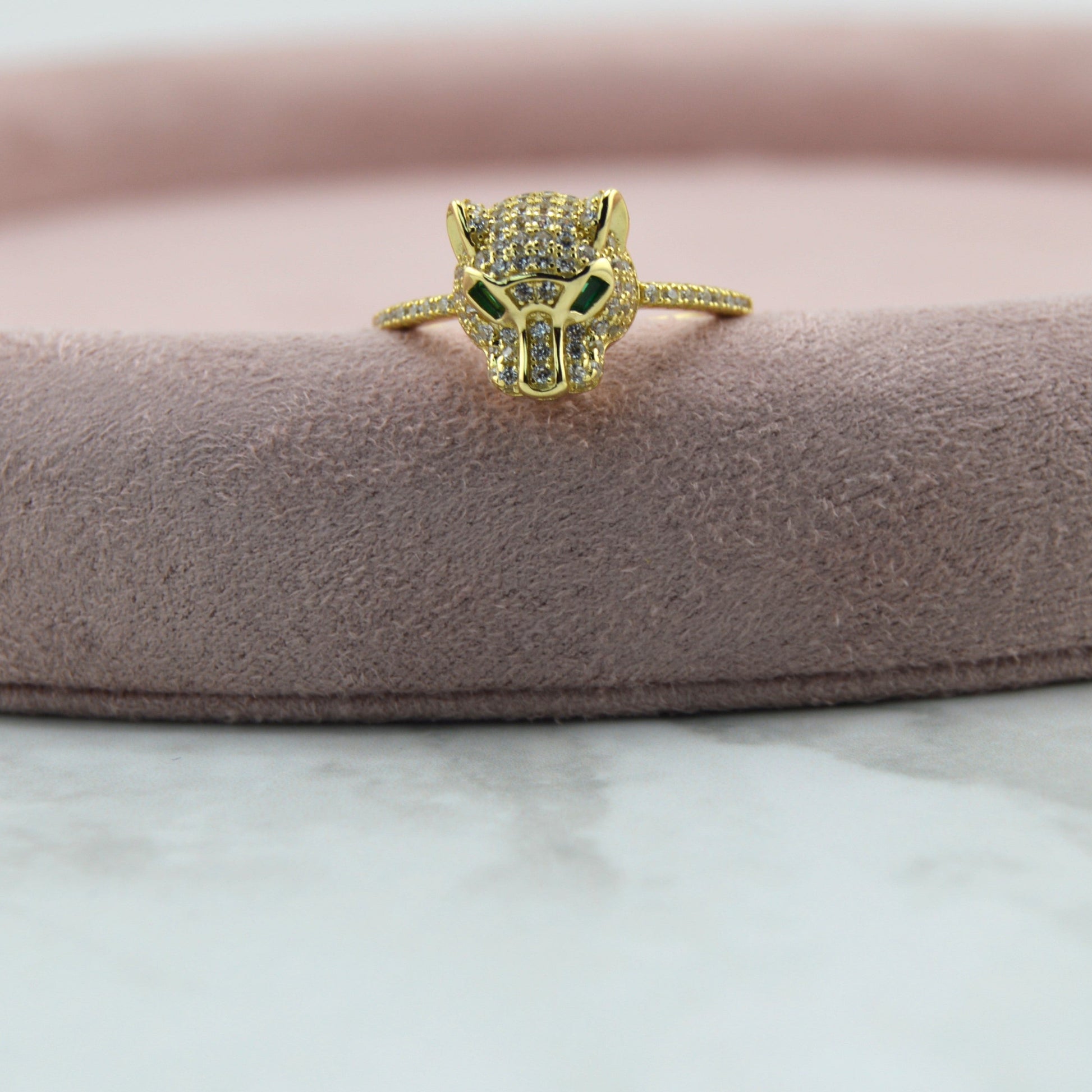 This 925 sterling silver panther/leopard ring features shimmering white cubic zirconia on the face and sides, with vibrant green cubic zirconia eyes that add a captivating touch. Designed to embody strength and elegance, it’s a unique piece that enhances your style with confidence and charm.