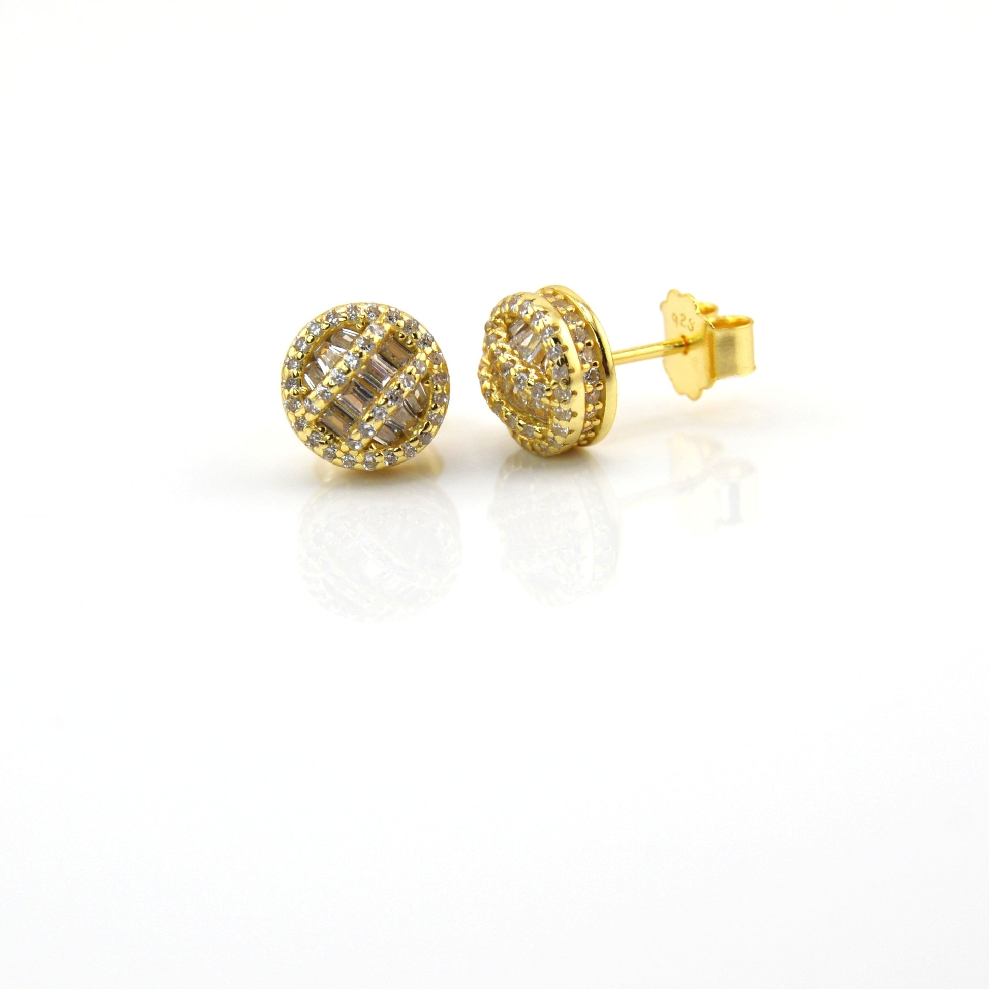 18K Gold Plated over 925 Sterling Silver Baguette CZ Circle Stud Earrings