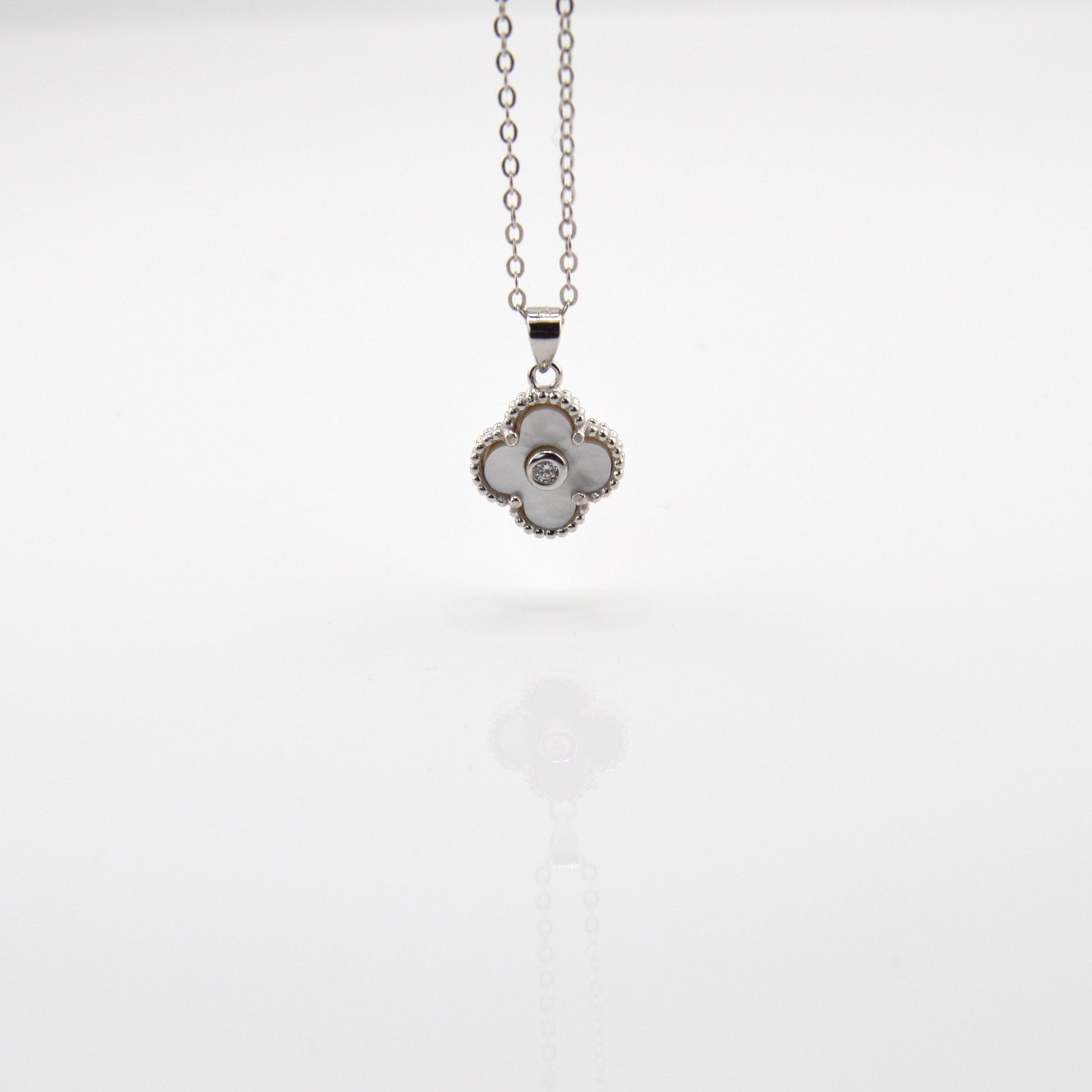 Crafted from 925 sterling silver, this necklace showcases a delicate four-leaf clover pendant adorned with luminous mother of pearl. A sparkling cubic zirconia at the center adds a gentle sparkle, making it a meaningful and stylish accessory to brighten your day with luck and inspire positivity.