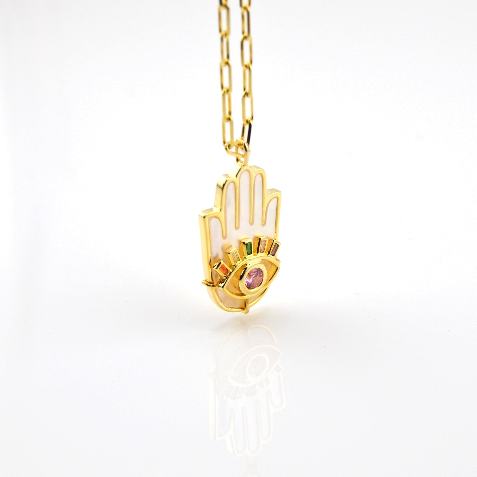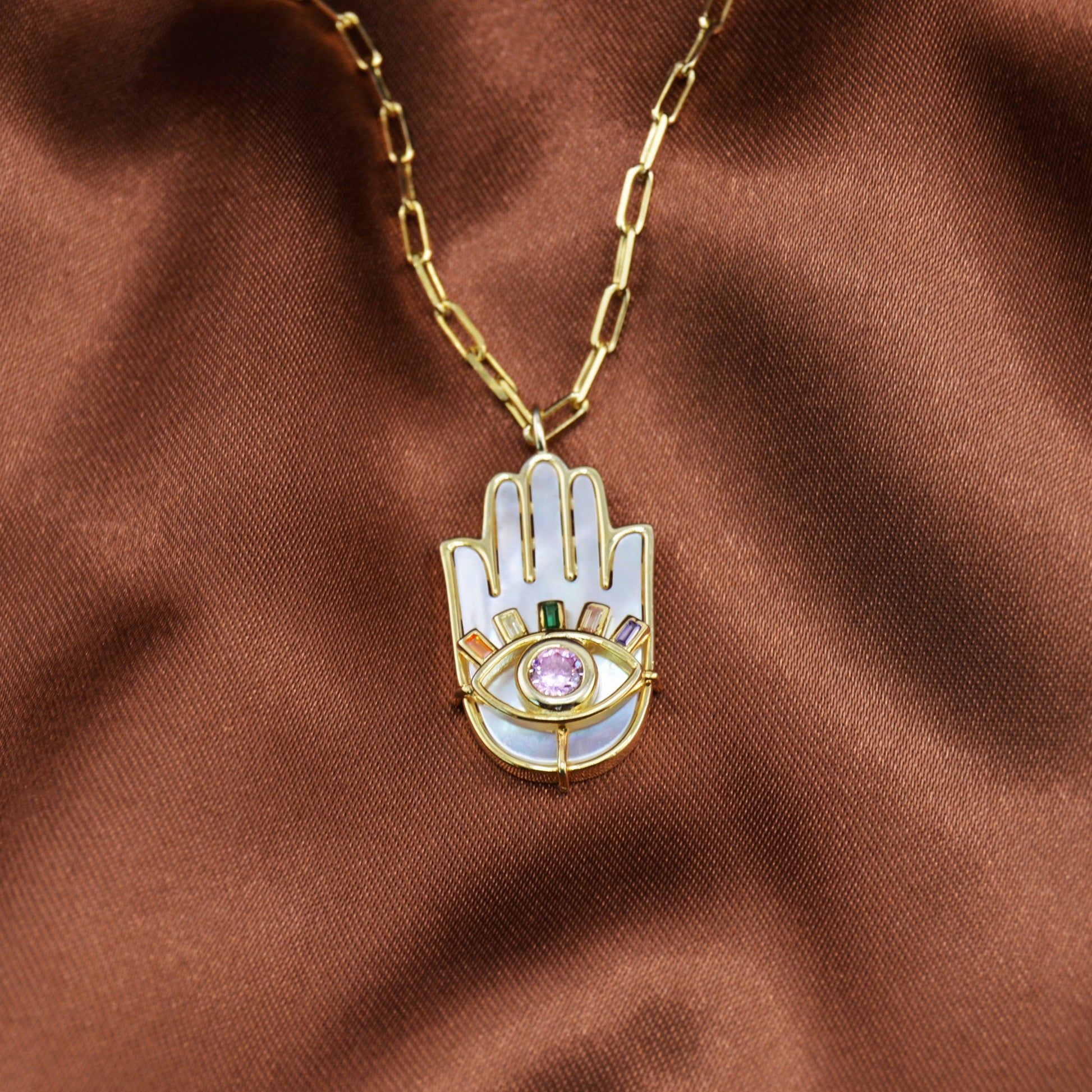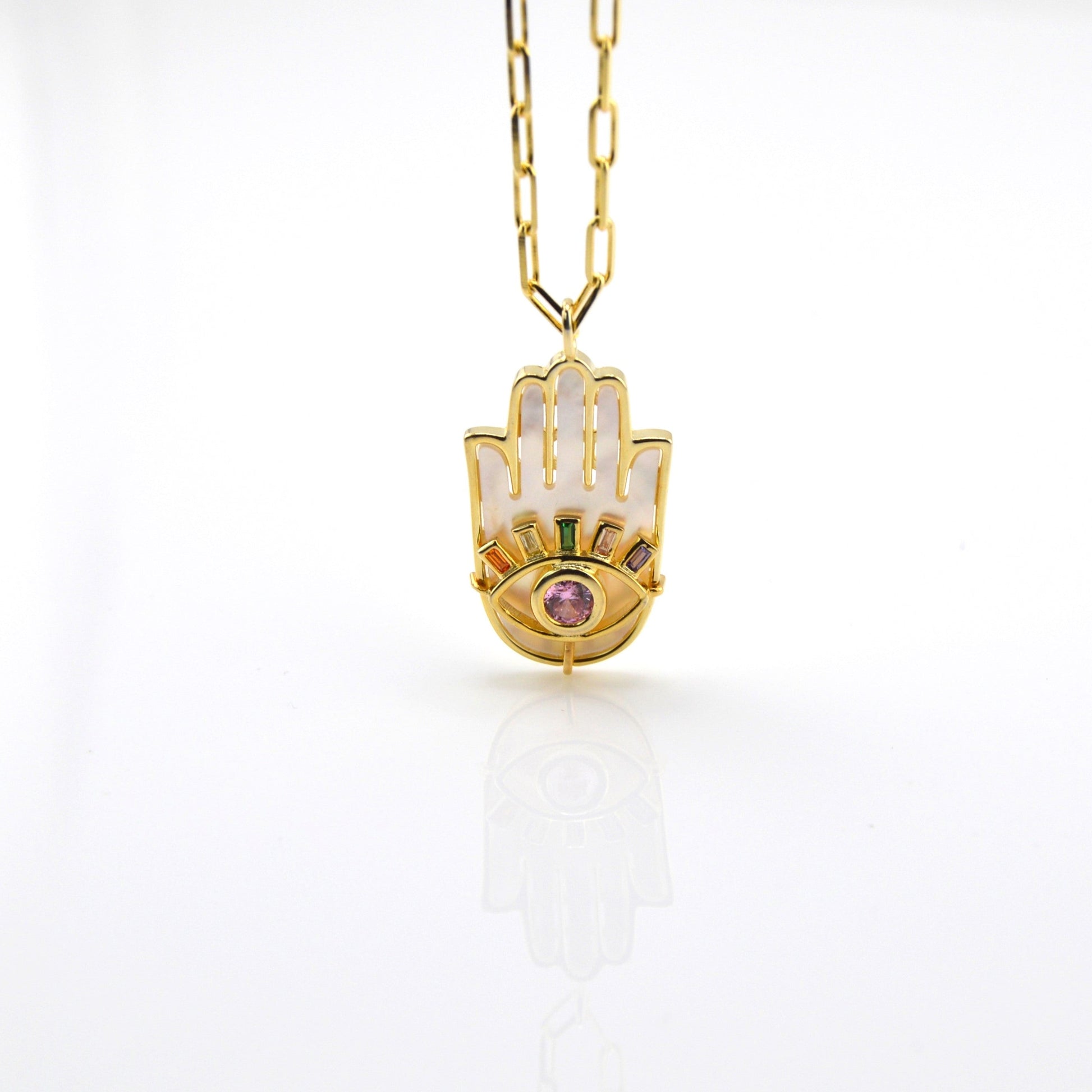 This exquisite Mother of Pearl Hamsa Necklace is made with 18k gold plated over 925 Sterling silver and adorned with multicolor cubic zirconia. The Hamsa symbolizes protection, adding both beauty and meaning to this piece. The delicate paper clip chain adds a touch of modernity to this traditional design.