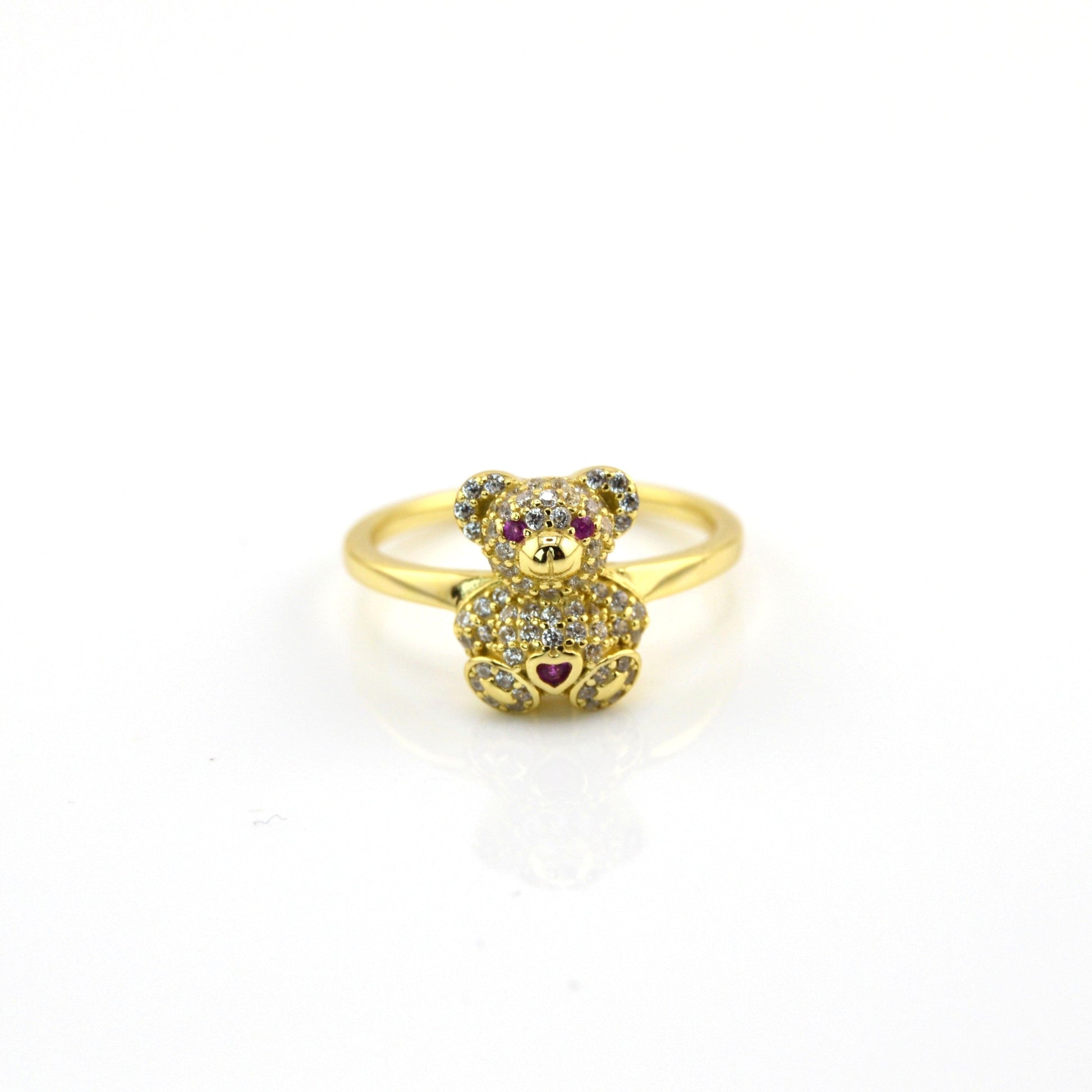 Expertly crafted from genuine 18k gold plated over 925 sterling silver, this Teddy Bear Pink Heart Ring features an adorable teddy bear encrusted with shining white cubic zirconia, holding a heart-shaped pink zirconia. The perfect accessory for any outfit, this ring adds a touch of cuteness and sparkle to your look.